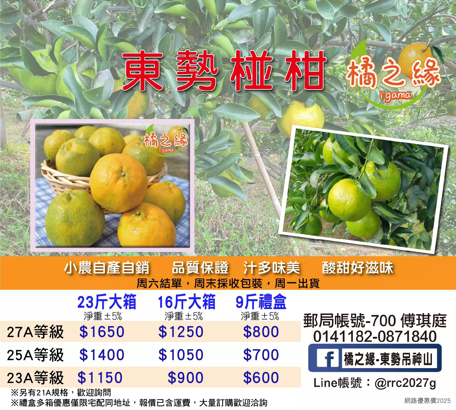 橘之緣是我們家自產自銷的品牌,我們以東勢橘子為基礎。我們父親把每棵橘子樹都當成自己的孩子一樣,用最細心的方式照顧,讓每一棵樹都能夠成長得健康而強壯。我們堅信,只有這樣才能種出果肥汁多,甜中帶微酸的好滋味橘子。